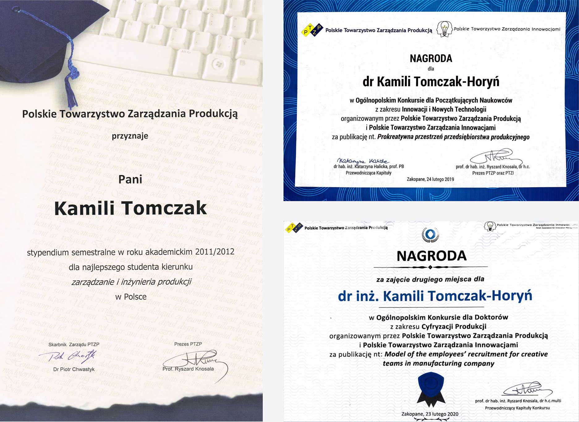 Tomczak – Horyń K., Knosala R.: Kryteria doboru pracowników do kreatywnych zespołów [w:] Knosala R. (red.): Innowacje w Zarządzaniu i Inżynierii Produkcji. Oficyna Wydawnicza Polskiego Towarzystwa Zarządzania Produkcją, Opole 2015, t. 1, s. 329 – 337.