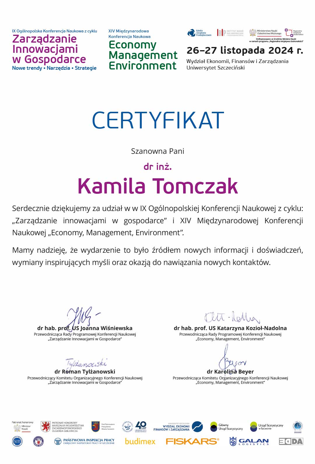 | 26 | 2017-2018 | Członek Komitetu Organizacyjnego Konferencji Innowacje w Zarządzaniu i Inżynierii Produkcji w Zakopanem organizowanej przez PTZP |