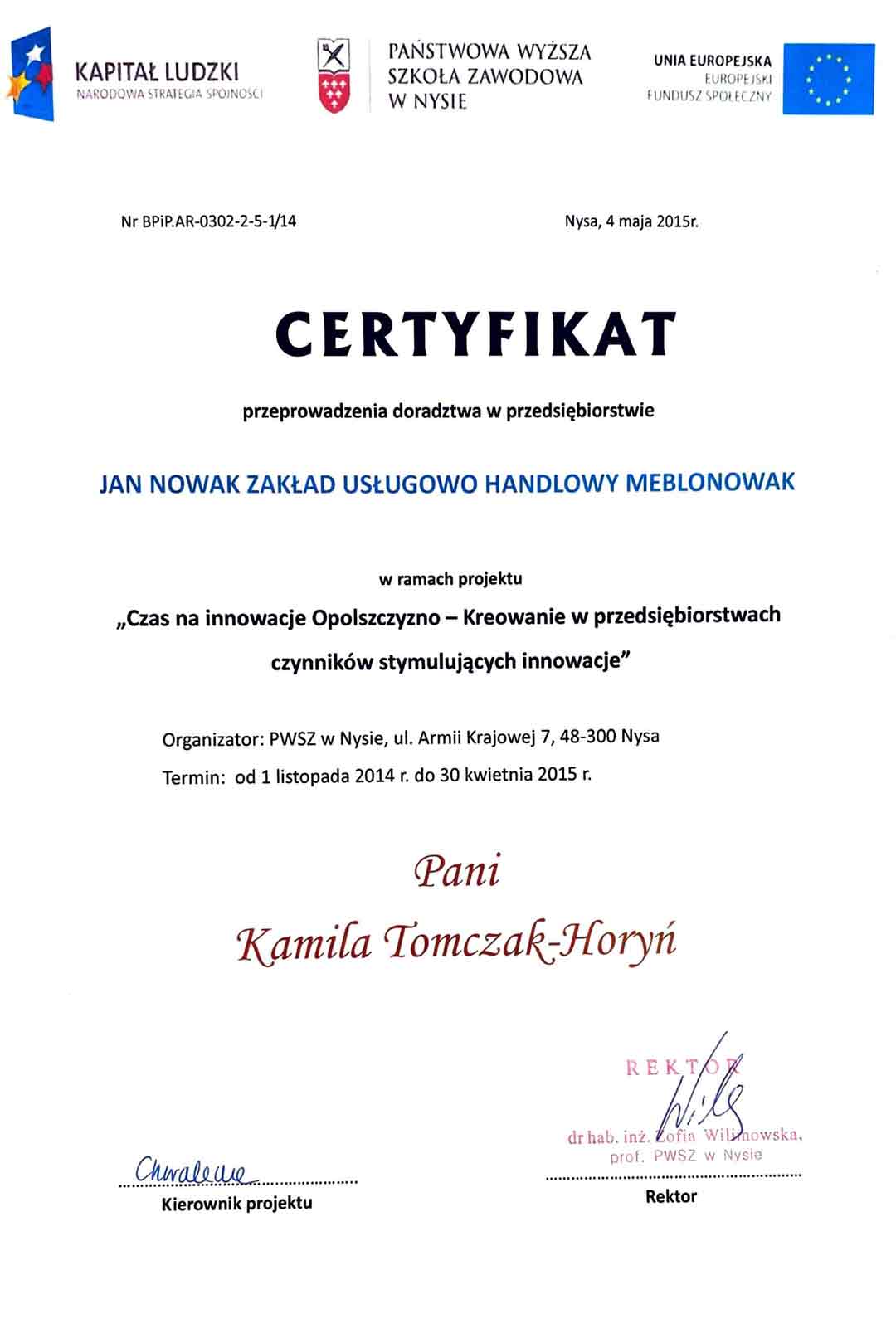 | 33 | 01.11.2014-30.04.2015 | Doradztwo w przedsiębiorstwie MEBLONOWAK w ramach projektu: "Czas na innowacje Opolszczyzno- Kreowanie w przedsiębiorstwach czynników stymulujących innowacje" |