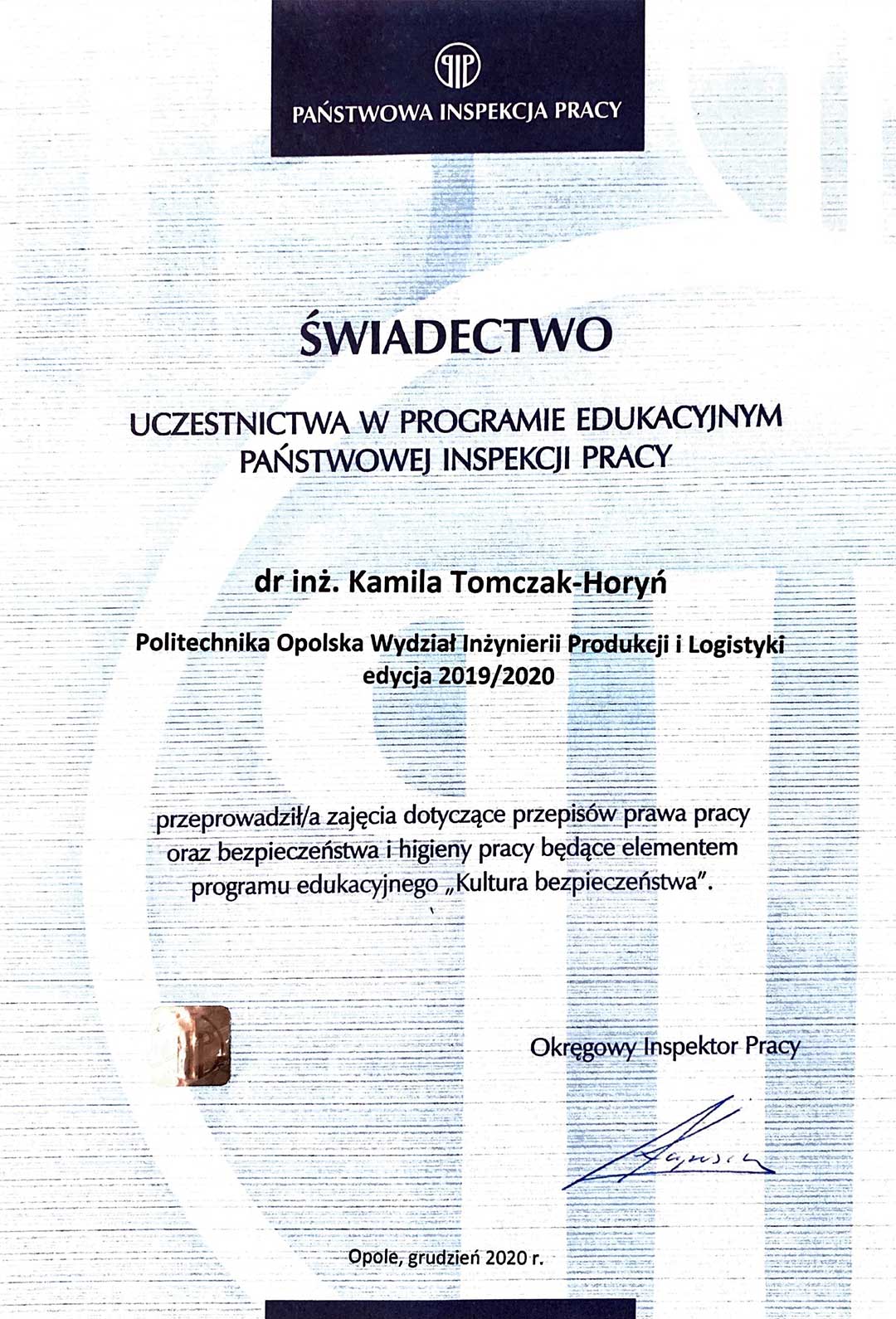 | 8 | 12.2020 | Uczestnictwo w programie edukacyjnym Państwowej Inspekcji Pracy. Prowadzenie zajęć dotyczących przepisów prawa pracy oraz BHP będące elementem programu edukacyjnego "Kultura bezpieczeństwa" |