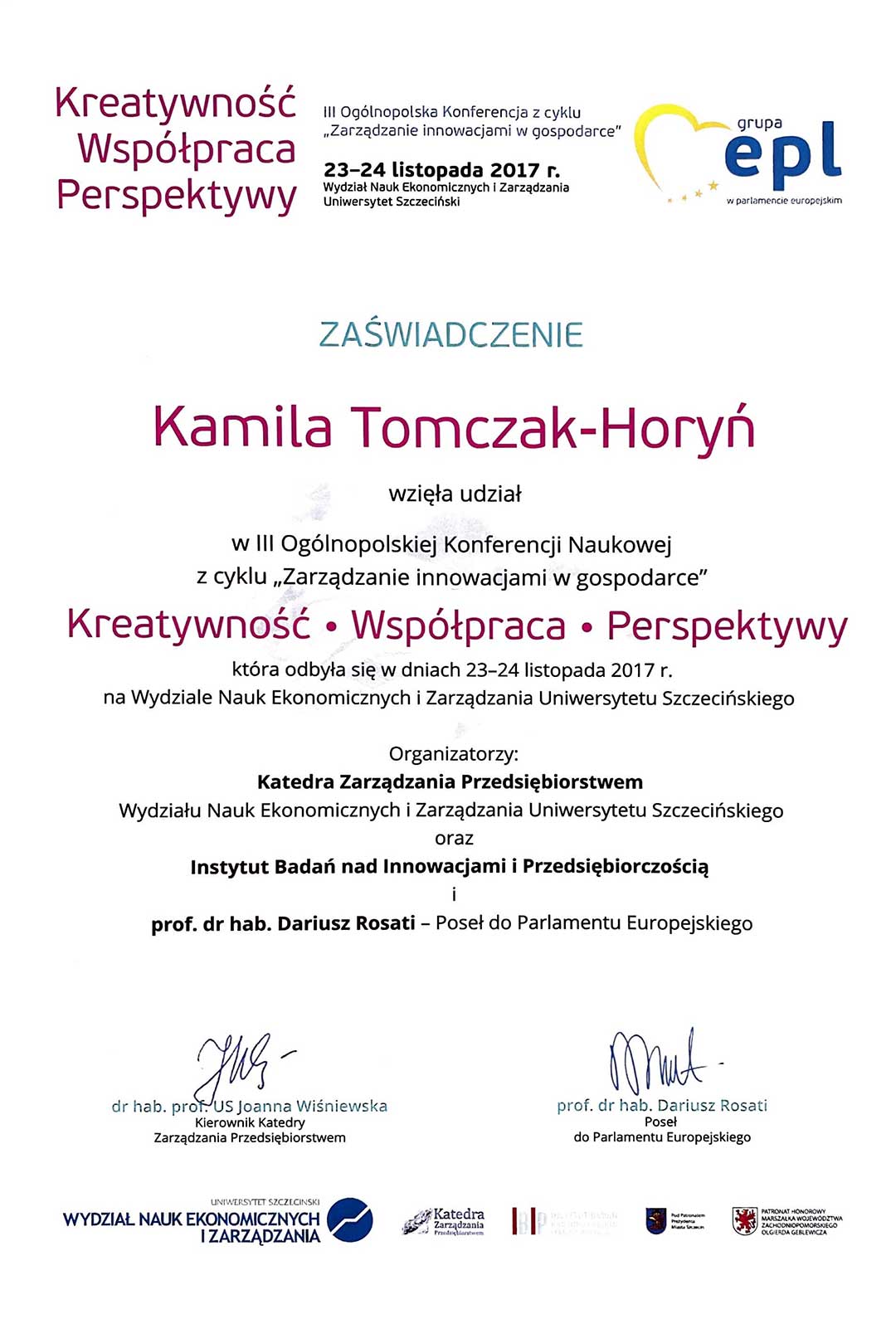 | 28 | 04.10.2017 | Prowadzenie warsztatów z Diagnozowania kreatywności pracowników i budowy twórczych zespołów w ramach I Warsztatów Poszukiwania Innowacyjnych Pomysłów, organizowanych przez PTZI oraz Regionalne Centrum Transferu Wiedzy i Technologii Innowacyjnych PWSZ w Nysie |