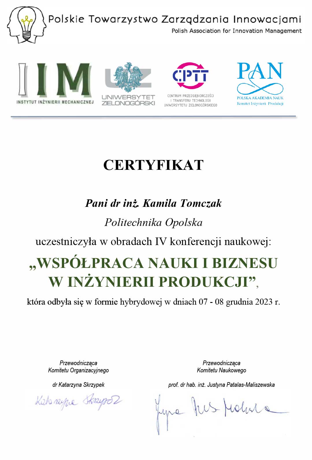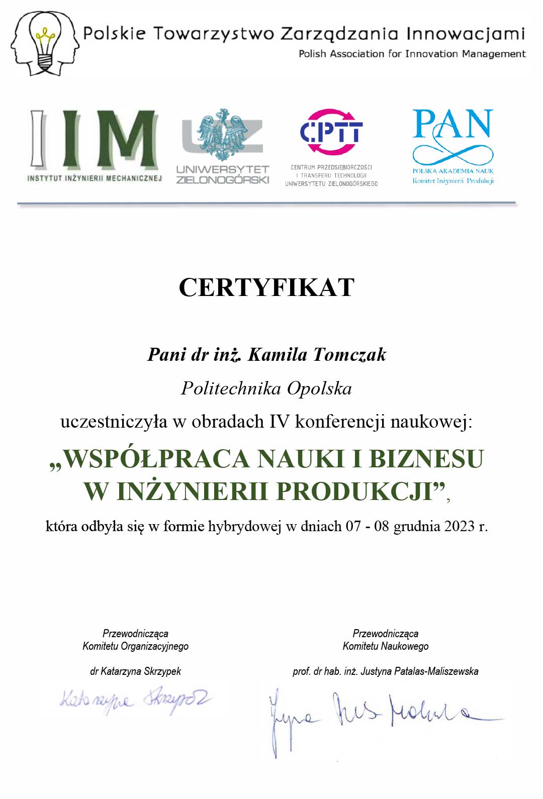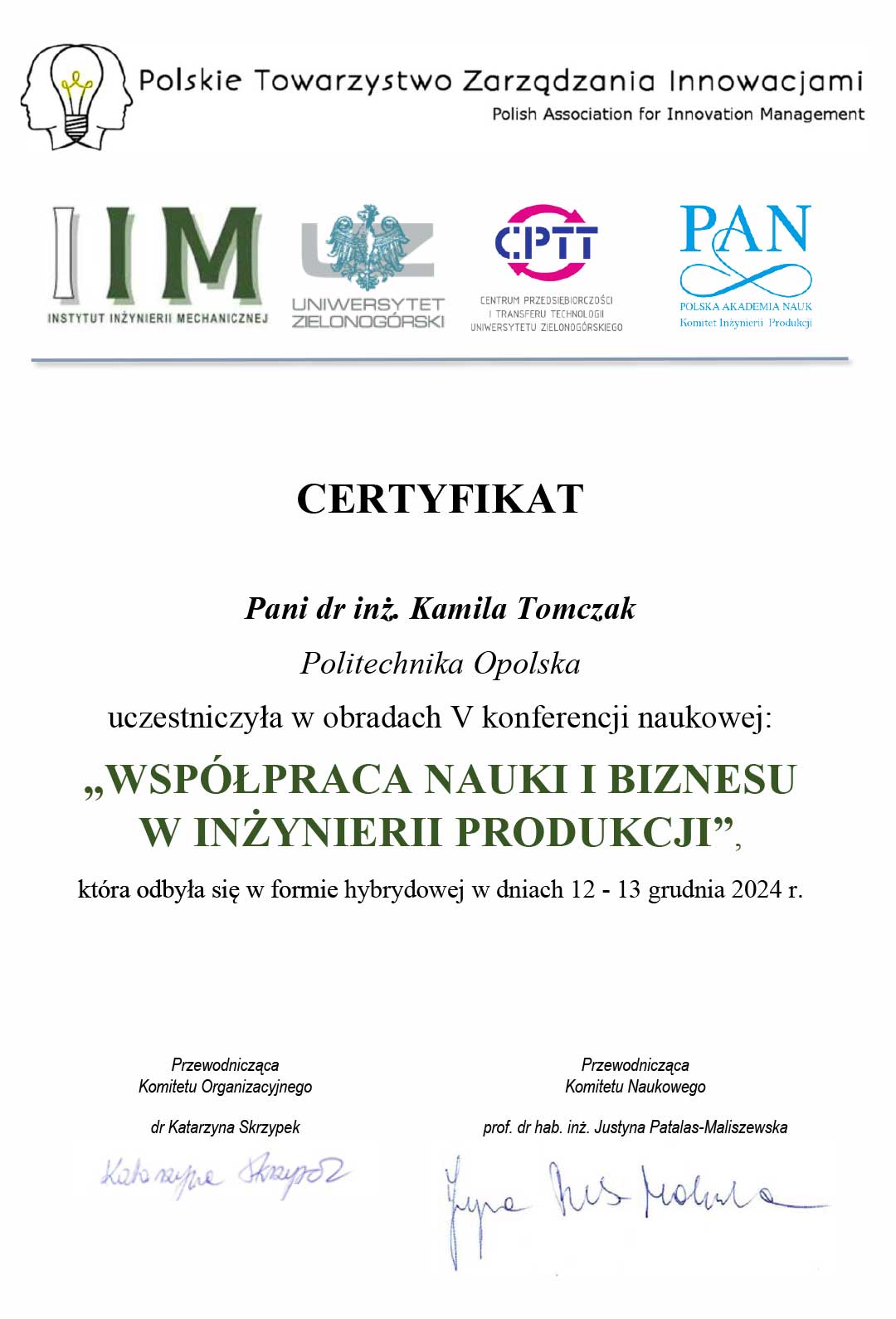 | 5 | 15.11.2021 | Recenzent pracy złożonej na konkurs na najlepszą pracę dyplomową na kierunkach Zarządzanie i Inżynieria Produkcji oraz Zarządzanie organizowanym przez PTZP |