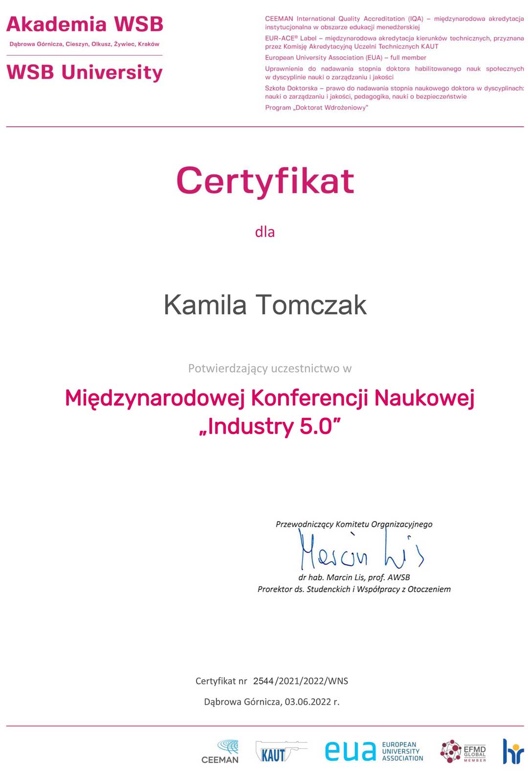 Tematem mojej rozprawy doktorskiej jest: „Badanie wpływu kreatywności pracowników na rozwój innowacji w obszarze inżynierii produkcji”. Przewód doktorski został otwarty 15.02.2017 r. na Wydziale Inżynierii Produkcji i Logistyki Politechniki Opolskiej. Stopień naukowy doktora nauk technicznych w zakresie inżynierii produkcji uzyskałam 06.02.2019 r