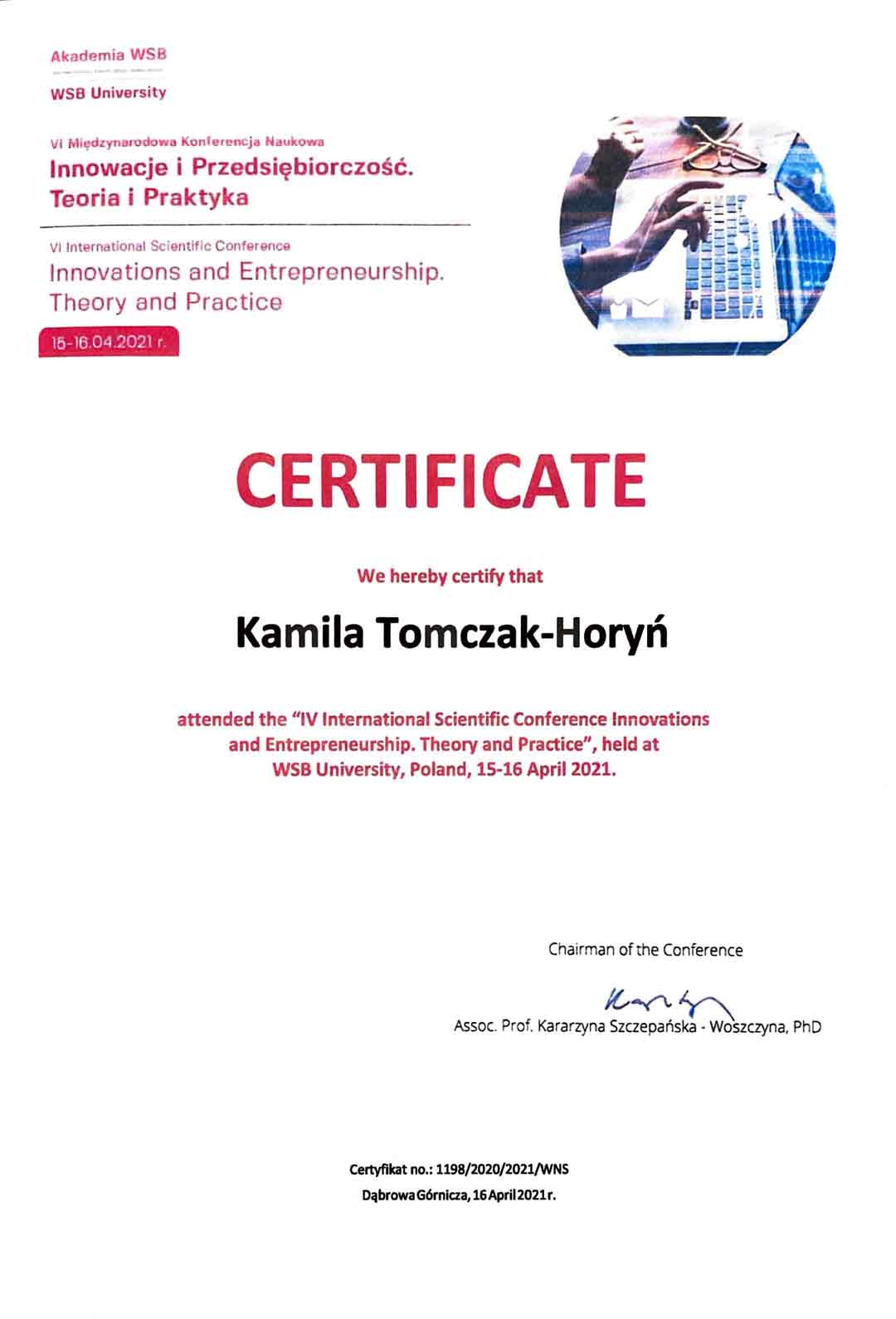 Tomczak – Horyń Kamila: Assessment of the creative culture and level of innovation in a company- case study. w: Vision 2020: Sustainable Economic Development and Application of Innovation Management from Regional Expansion to Global Growth. Proceedings of the 35nd International Business Information Management Association Conference (IBIMA) / Soliman Khalid S. ( red. ), 2020, International Business Information Management Association ,ISBN: 978-0-9998551-4-0, ss. 11142-11149.