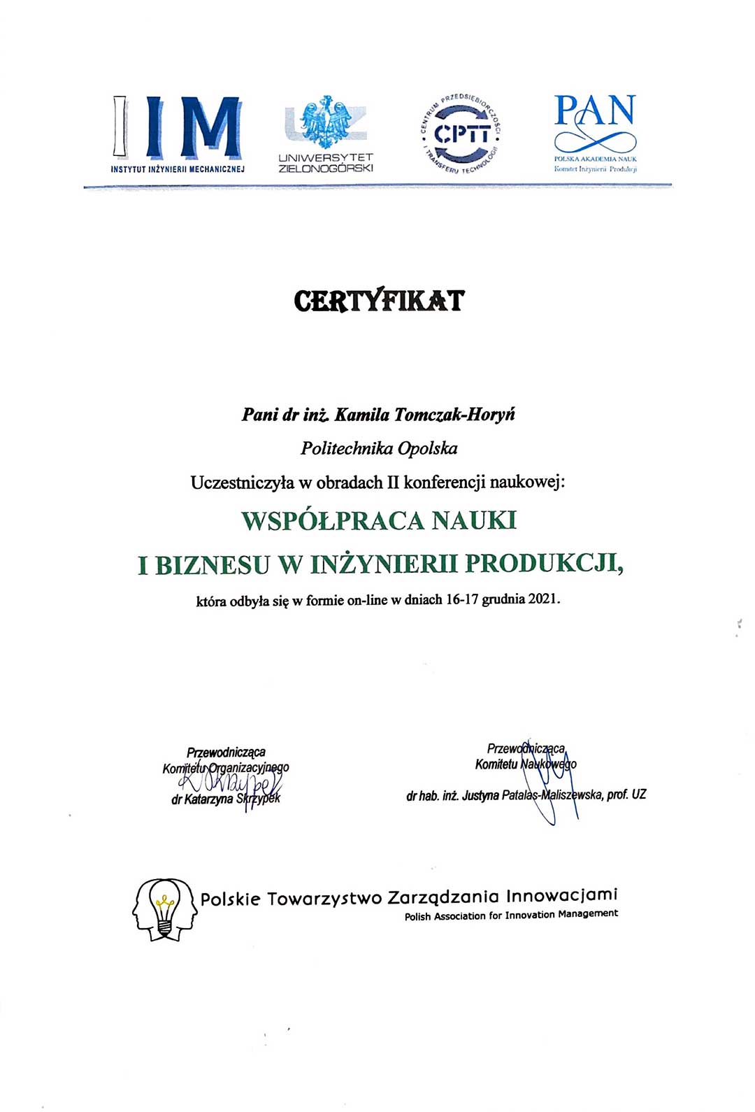 | 5 | 15.11.2021 | Recenzent pracy złożonej na konkurs na najlepszą pracę dyplomową na kierunkach Zarządzanie i Inżynieria Produkcji oraz Zarządzanie organizowanym przez PTZP |