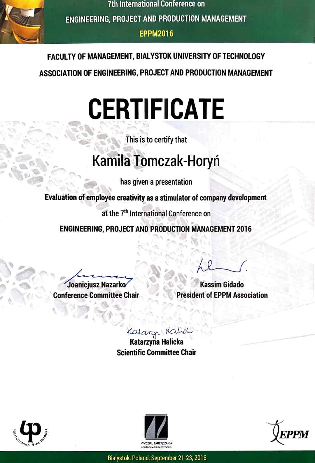 Tomczak – Horyń K., Knosala R.: Evaluation of employee creativity in the context of production accounting system, [w:] Czasopismo Techniczne- Technical Transations. Wyd. Politechniki Krakowskiej, Kraków 2014, s. 64 – 73.