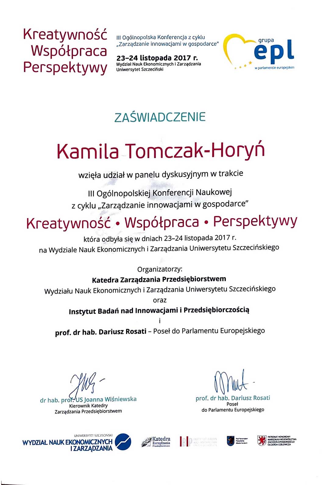 | 28 | 04.10.2017 | Prowadzenie warsztatów z Diagnozowania kreatywności pracowników i budowy twórczych zespołów w ramach I Warsztatów Poszukiwania Innowacyjnych Pomysłów, organizowanych przez PTZI oraz Regionalne Centrum Transferu Wiedzy i Technologii Innowacyjnych PWSZ w Nysie |