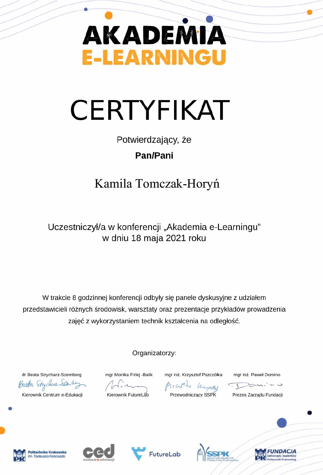 | 13 | 10.2020-10.2021 | Udział w projekcie Inżynier XXI wieku przyszłością kluczowych gałęzi gospodarki" |